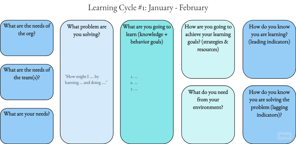 Learning cycles are at the core of purposeful, self-directed learning. Every 1-3 months, depending on the needs of the individual, team, and org at that moment, you look ahead and (re)define what you want to learn and how you’ll accomplish this. Using a learning contract can help structure this. Also, self-directed learning is not done in isolation. You seek input from others, validate ideas, and discuss your learning contract with relevant people within or even outside your organization.